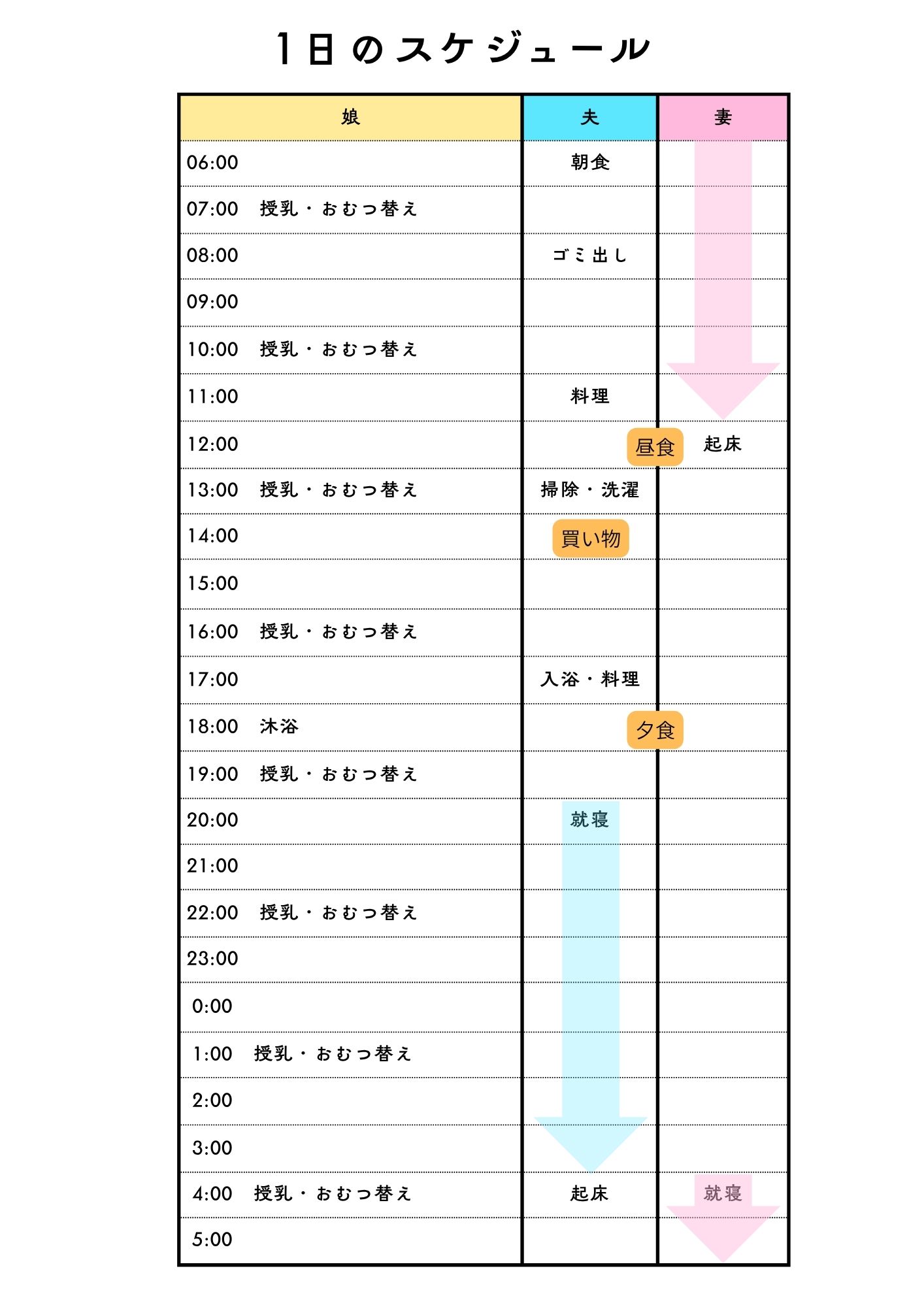 新生児期の授乳・おむつ替えは基本的に3時間おきで、夜中も続きます。このスケジュールを見ると「妻が正午に起きて4時に寝る」という昼夜逆転の生活リズムになっていますが、これには理由があります。次の項目で詳しく説明します。
