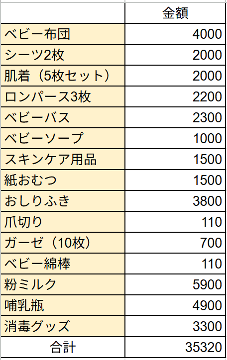 最低限ではありますが、これだけあれば出産直後の生活は問題なく過ごせました。